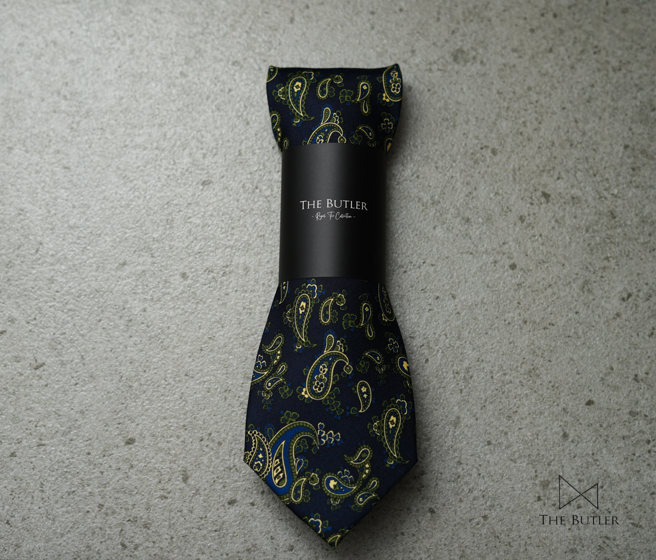 Introducing The Norman – Blue Paisley Tie, an 8 cm wide statement of timeless elegance. Its rich blue background is adorned with intricate light green paisley motifs, detailed with subtle off-white and light blue highlights. This refined color combination creates a sophisticated yet versatile design, perfect for weddings, evening occasions, or distinguished business attire. The Norman embodies The Butler Sri Lanka’s philosophy of quiet luxury and heritage-inspired craftsmanship.